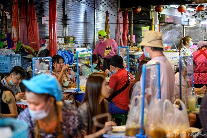 【1月13日 AFP】タイの首都バンコクのチャイナタウンで10日、パーティション越しに屋台で食事を楽しむ人々の姿がみられた。パーティションの設置は、当局による新型コロナウイルス感染症(COVID-19)対策の一環で飲食店に定められた規制を受けたもの。(c)AFP