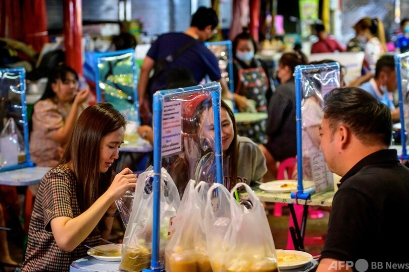 【1月13日 AFP】タイの首都バンコクのチャイナタウンで10日、パーティション越しに屋台で食事を楽しむ人々の姿がみられた。パーティションの設置は、当局による新型コロナウイルス感染症(COVID-19)対策の一環で飲食店に定められた規制を受けたもの。(c)AFP