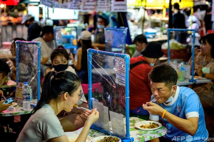 【1月13日 AFP】タイの首都バンコクのチャイナタウンで10日、パーティション越しに屋台で食事を楽しむ人々の姿がみられた。パーティションの設置は、当局による新型コロナウイルス感染症(COVID-19)対策の一環で飲食店に定められた規制を受けたもの。(c)AFP