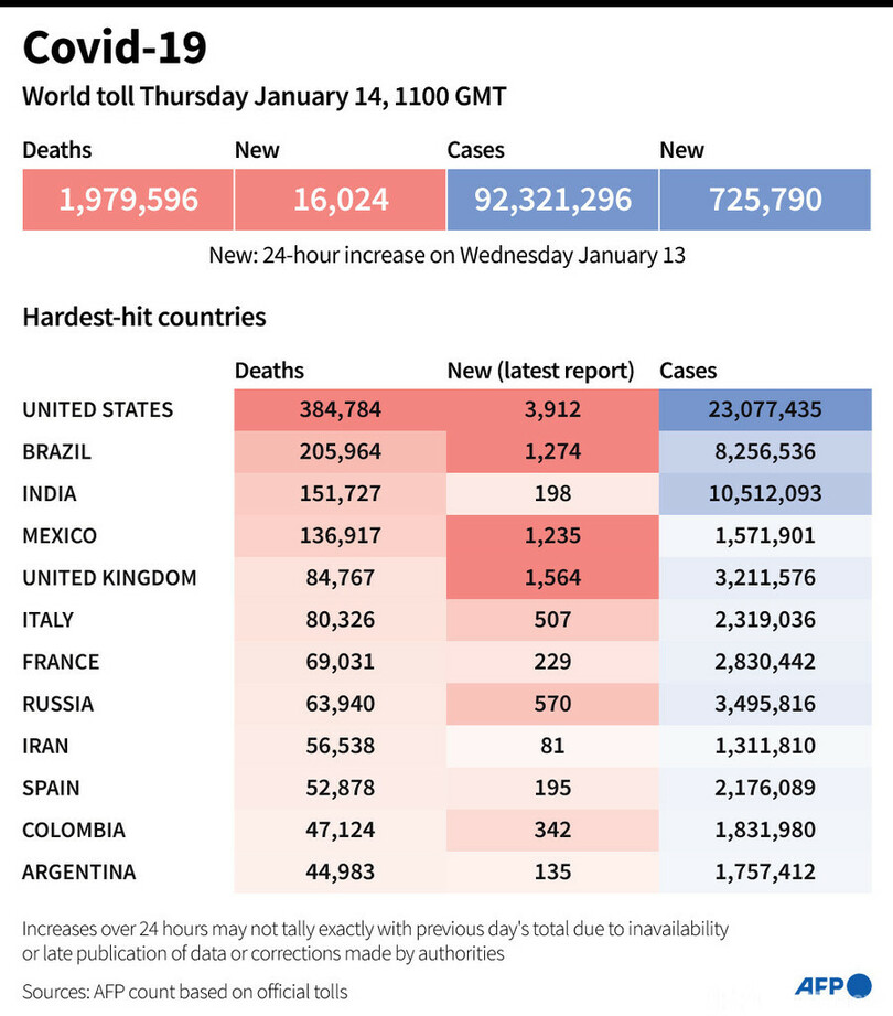 【1月15日 AFP】AFPが各国当局の発表に基づき日本時間14日午後8時にまとめた統計によると、世界の新型コロナウイルスによる死者数は197万9596人に増加した。