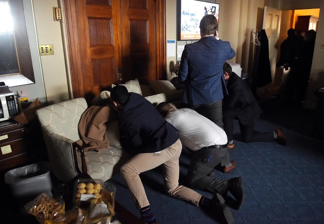 それぞれの部屋にいた職員らはドアの前にバリケードを築くため、テーブルや椅子を(外にいるデモ隊に)気付かれないよう静かに移動させた。「そこで、テキストメッセージで発砲があったことを知った。私たちには、何が起きているのか全然分からなかった。1台のテレビがCNNを流していたが、音を立てないよう音量を下げた」。CNNは間もなくすると、自局の取材班の身に危険が及ぶ可能性があるため、議事堂内部からの中継をやめた。「八方ふさがりだった。最初は、ここで起きているいろいろな動きを見逃してしまうと思ったが思い直し、自分は職員たちと一緒にいるのだから、彼らのことを記事にしようと思い立った」とオリビエは言う。