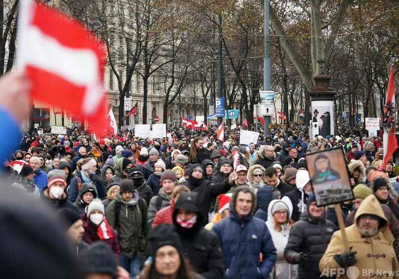 【1月17日 AFP】オーストリアの首都ウィーンで16日、新型コロナウイルス対策の制限措置に抗議し、首相の辞任を求めるデモが行われ、1万人近くが参加した。警察が発表した。