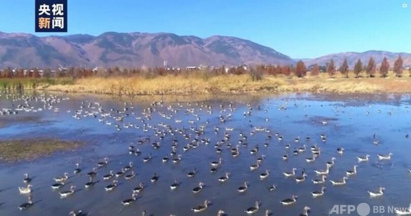 ハイイロガンは主に湖や湿地、沼などの淡水域に生息し、植物の葉や根、茎、果実、ニシ(螺)、エビ、昆虫などを食べます。洱源県は近年、湿地の回復と保護に力を入れています。湿地面積は1980年代の水準にまで回復し、水鳥の種類も増え続けています。長年の観測の結果、越冬のために飛来するハイイロガンは3年前の60羽余りから1万羽前後に増えていることが分かりました。(c)CGTN Japanese/AFPBB News