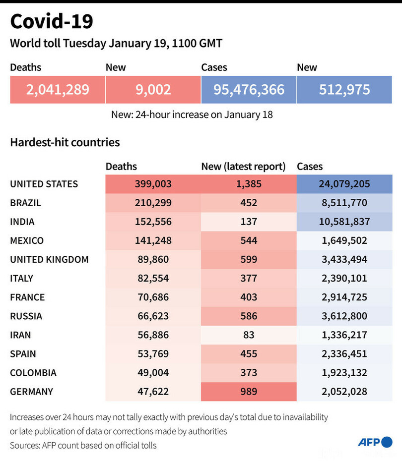 【1月20日 AFP】AFPが各国当局の発表に基づき日本時間19日午後8時にまとめた統計によると、世界の新型コロナウイルスによる死者数は204万1289人に増加した。これまでに世界で少なくとも9547万6360人の感染が確認されている。