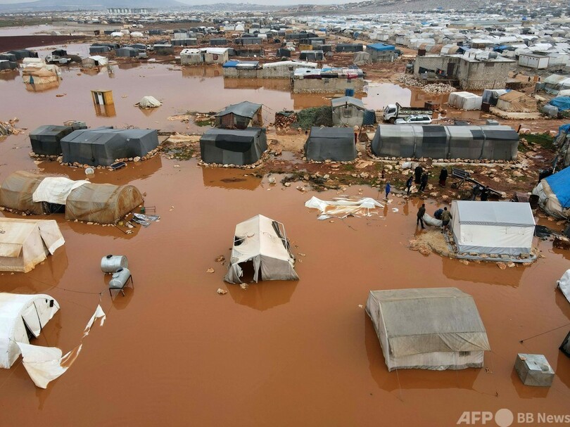 AFP特派員によると、反体制派が支配するイドリブ県にあるキャンプでは連日の雨により、紛争で避難民となった家族らの仮設テントが泥水に漬かった状態で取り残されている。