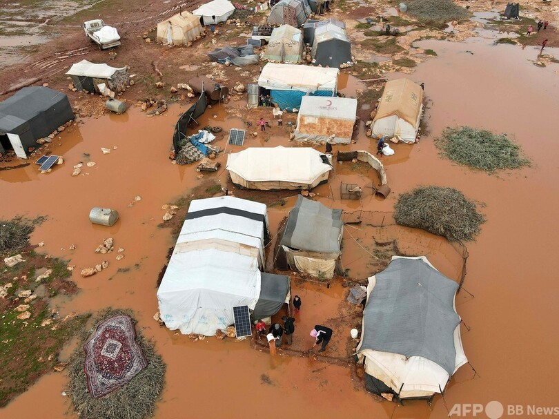 AFP特派員によると、反体制派が支配するイドリブ県にあるキャンプでは連日の雨により、紛争で避難民となった家族らの仮設テントが泥水に漬かった状態で取り残されている。