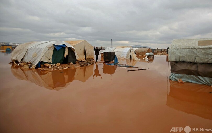 AFP特派員によると、反体制派が支配するイドリブ県にあるキャンプでは連日の雨により、紛争で避難民となった家族らの仮設テントが泥水に漬かった状態で取り残されている。