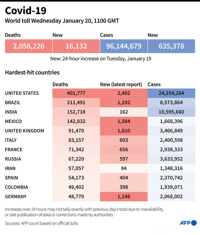 【1月21日 AFP】AFPが各国当局の発表に基づき日本時間20日午後8時にまとめた統計によると、世界の新型コロナウイルスによる死者数は205万8226人に増加した。これまでに世界で少なくとも9614万4670人の感染が確認されている。
