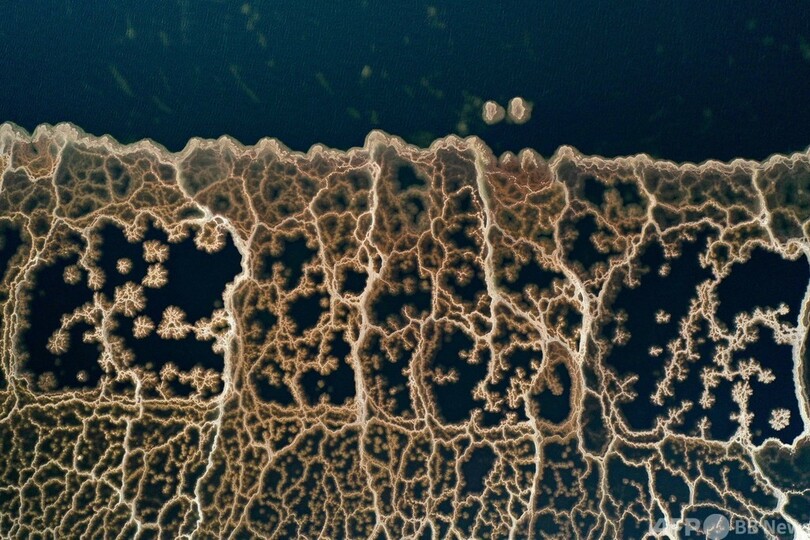 【2月1日 AFP】蒸発で結晶化した鉱物による模様が浮かび上がった死海(Dead Sea)の表面を写した空撮写真。イスラエル南部ネベゾハール(Neve Zohar)近くで。(c)AFP