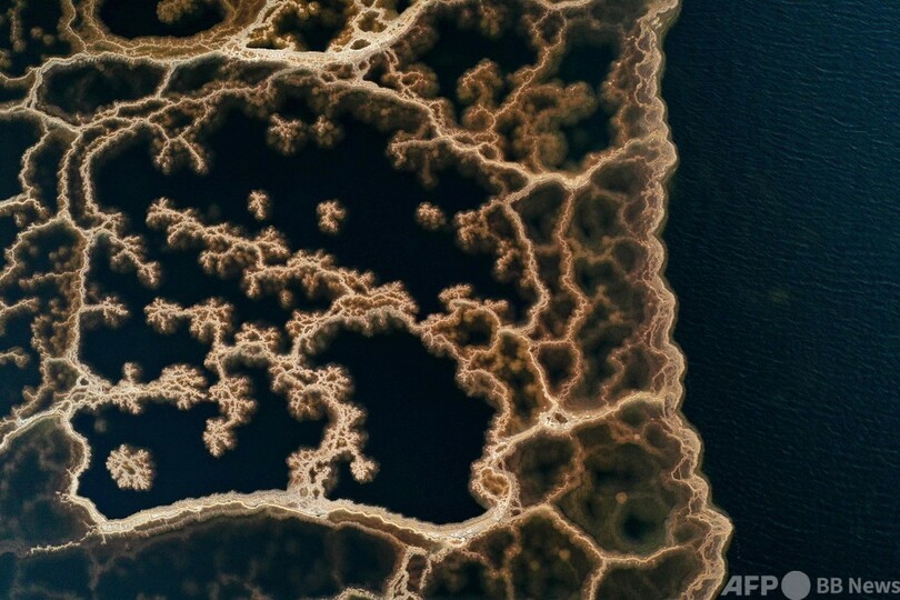 【2月1日 AFP】蒸発で結晶化した鉱物による模様が浮かび上がった死海(Dead Sea)の表面を写した空撮写真。イスラエル南部ネベゾハール(Neve Zohar)近くで。(c)AFP