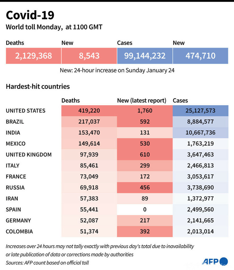 【1月26日 AFP】AFPが各国当局の発表に基づき日本時間25日午後8時にまとめた統計によると、世界の新型コロナウイルスによる死者数は212万9368人に増加した。