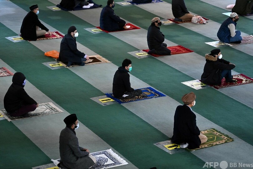 【1月26日 AFP】英ロンドン南西部にあるモスク(イスラム礼拝所)では、対人距離を保ちながら金曜礼拝が行われている。