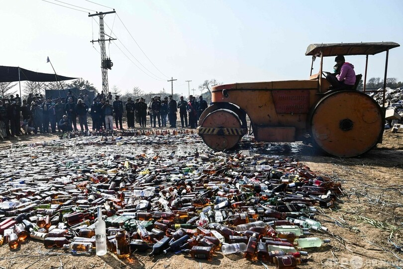 【1月27日 AFP】パキスタンのラホール(Lahore)で26日、国際税関記念日(International Customs Day)の式典が行われ、税関職員らが押収した酒瓶をロードローラーで潰したり、薬物を燃やしたりした。(c)AFP