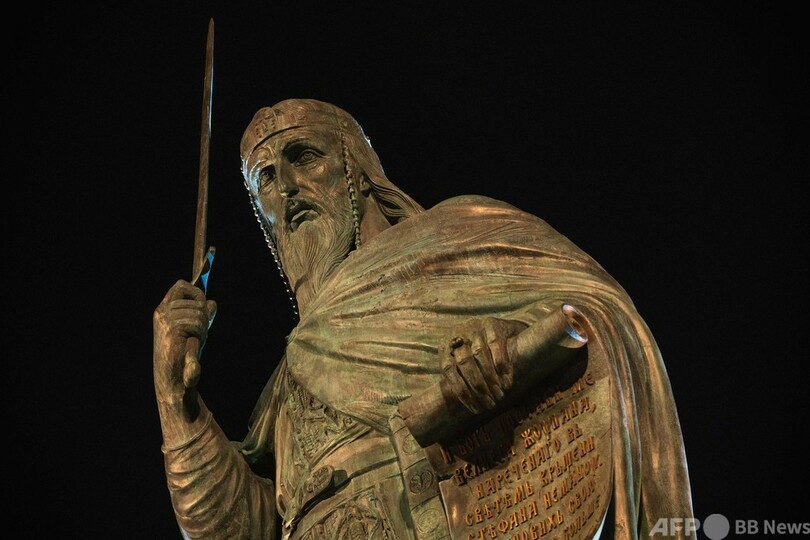 論争となっているのは、セルビア王国を建国した人物として知られる12世紀のステファン・ネマニャ(Stefan Nemanja)王子をモデルにつくられた銅像だ。明るい光で照らされた銅像の高さは23メートルを超える。除幕式が27日に行われた。