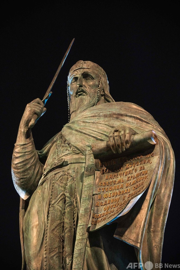 論争となっているのは、セルビア王国を建国した人物として知られる12世紀のステファン・ネマニャ(Stefan Nemanja)王子をモデルにつくられた銅像だ。明るい光で照らされた銅像の高さは23メートルを超える。除幕式が27日に行われた。