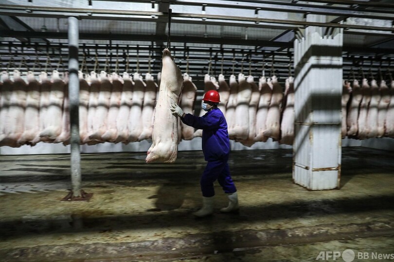 【1月28日 AFP】中国北東部遼寧(Liaoning)省瀋陽(Shenyang)にある食品工場で、来月の春節(旧正月、Lunar New Year)休暇に向け、十分な供給が確保できるよう、豚肉の加工作業が進められている。(c)AFP