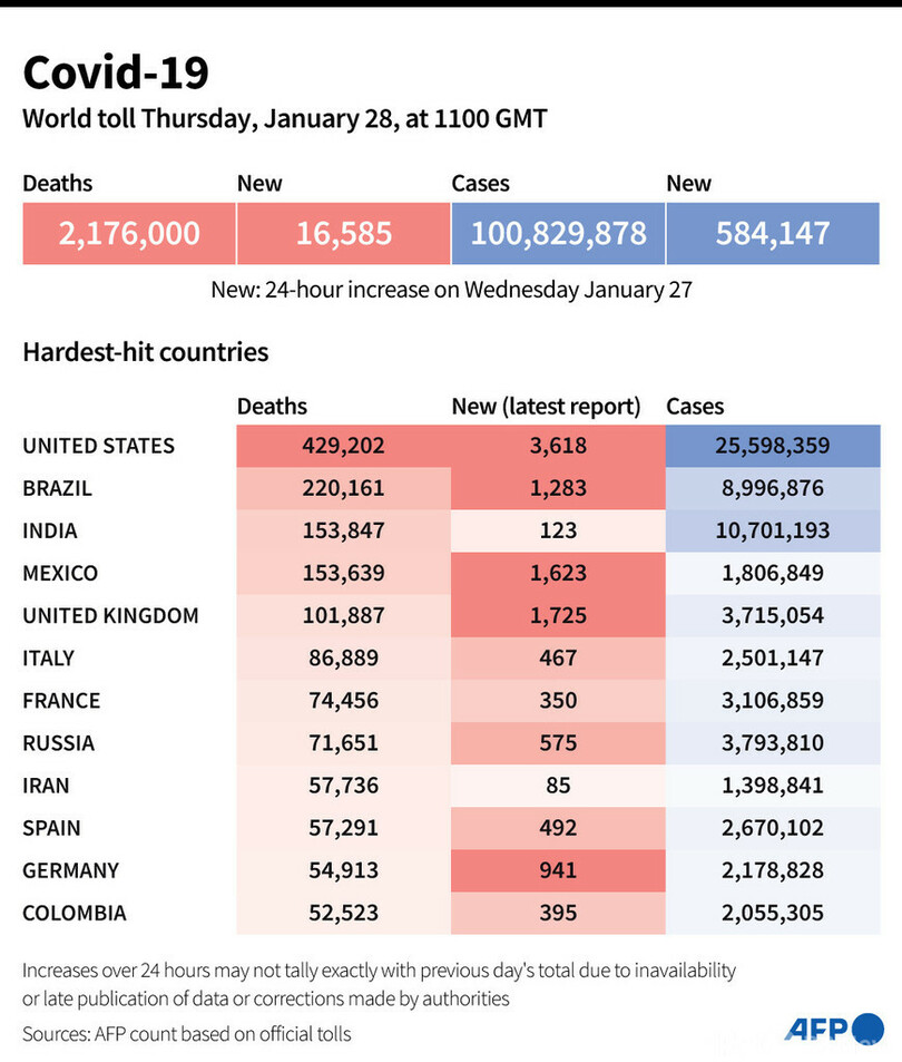 【1月29日 AFP】AFPが各国当局の発表に基づき日本時間28日午後8時にまとめた統計によると、世界の新型コロナウイルスによる死者数は217万6000人に増加した。