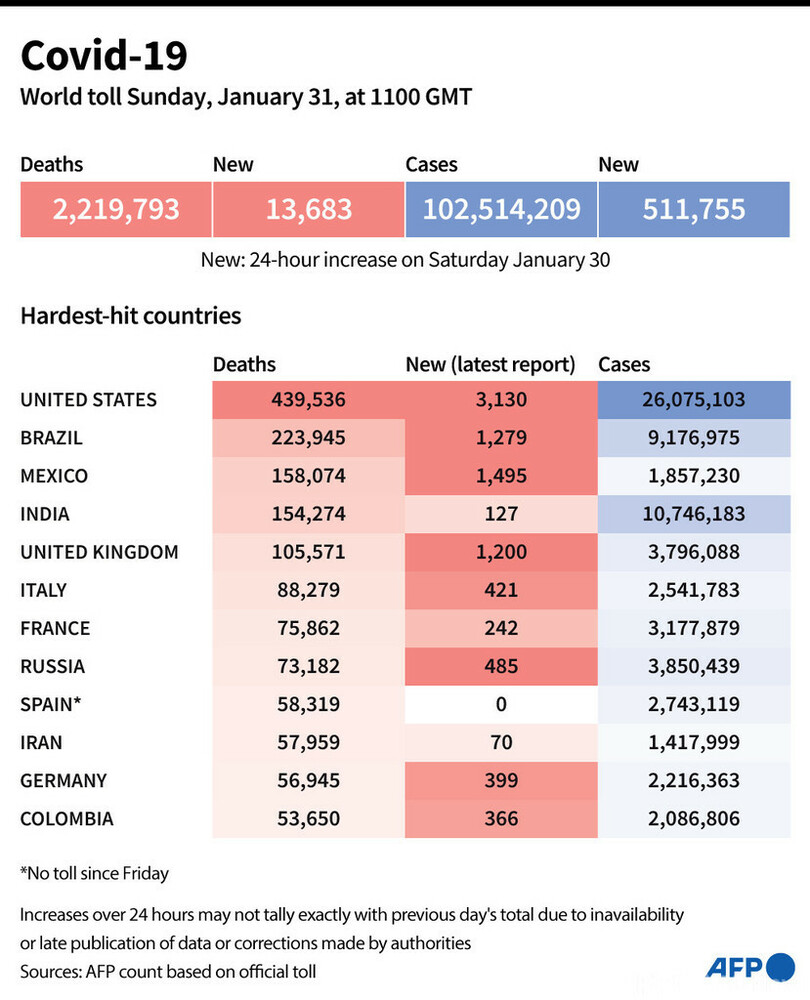 【2月1日 AFP】AFPが各国当局の発表に基づき日本時間1月31日午後8時にまとめた統計によると、世界の新型コロナウイルスによる死者数は221万9793人に増加した。