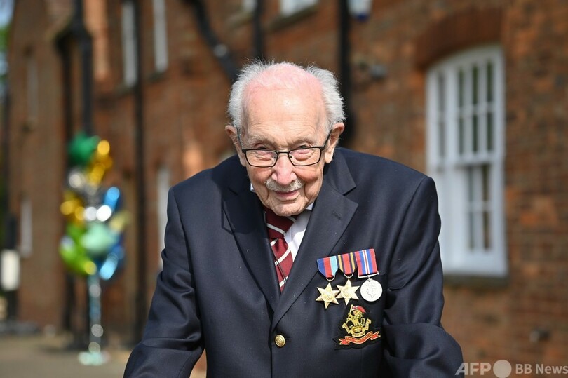 第2次世界大戦(World War II)中にインドやミャンマーで従軍した退役軍人のムーアさんは、新型ウイルスと最前線で闘う医療従事者らのために寄付を募ろうと自宅の庭を歩行器で25メートルを100回歩くチャレンジに成功して多額の寄付金を集めた。その後、医療従事者への応援歌として歌ったカバー曲、「You'll Never Walk Alone」では、国内の音楽シングルチャートで史上最高齢の1位を獲得した。