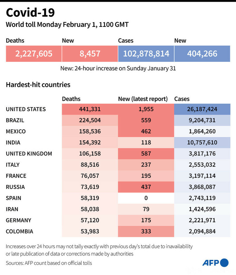 【2月2日 AFP】AFPが各国当局の発表に基づき日本時間1日午後8時にまとめた統計によると、世界の新型コロナウイルスによる死者数は222万7605人に増加した。