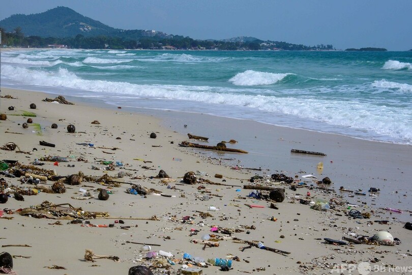 大量のビーチサンダルやプラスチックボトルなどのごみが、浜辺に打ち上げられている。波間には、海藻に交じりカラフルなプラスチック片が漂っていた。(c)AFP