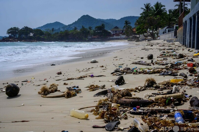 大量のビーチサンダルやプラスチックボトルなどのごみが、浜辺に打ち上げられている。波間には、海藻に交じりカラフルなプラスチック片が漂っていた。(c)AFP