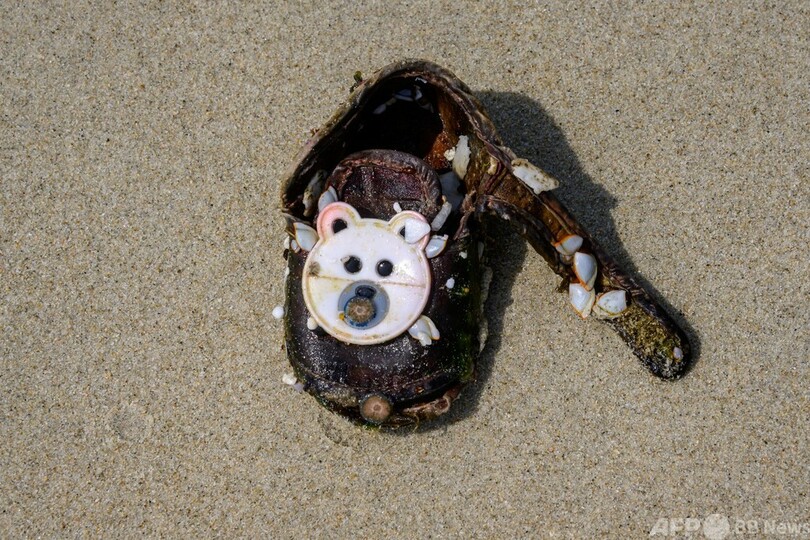 大量のビーチサンダルやプラスチックボトルなどのごみが、浜辺に打ち上げられている。波間には、海藻に交じりカラフルなプラスチック片が漂っていた。(c)AFP