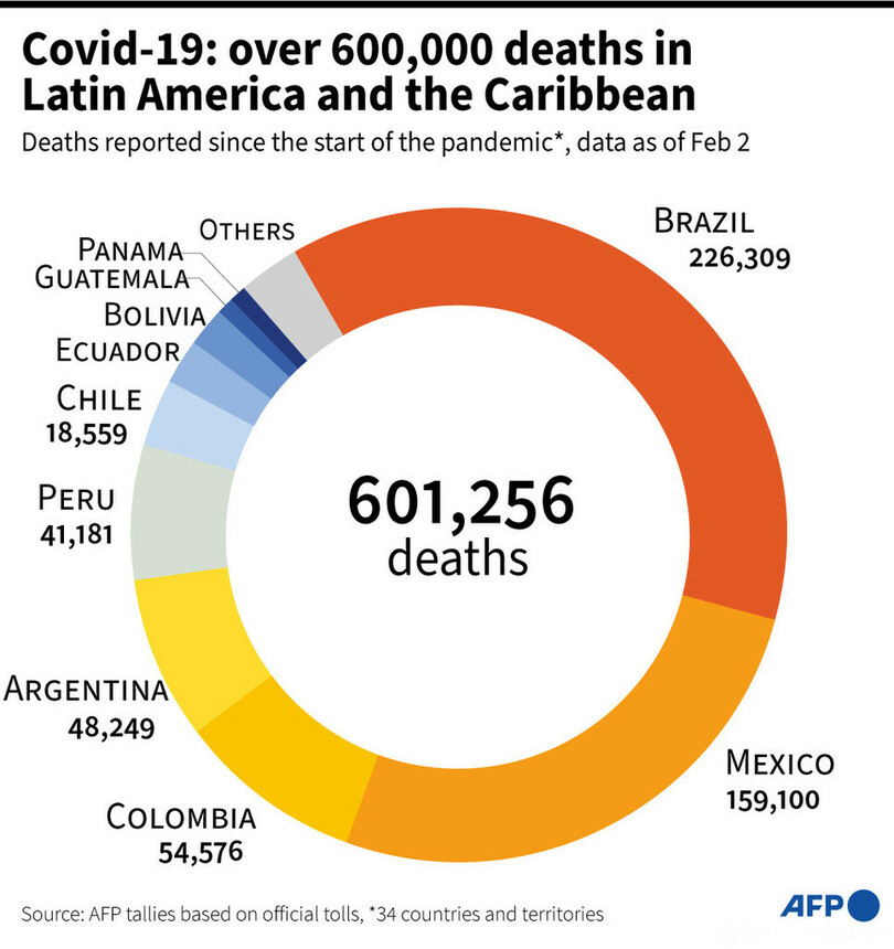 【2月3日 AFP】中南米で新型コロナウイルスのためこれまでに亡くなった人が60万人を超えたことが、各国の公式統計に基づくAFPの集計で2日、明らかになった。