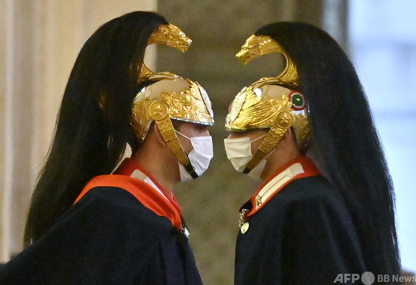 クイリナーレ宮ではジュセッペ・コンテ(Giuseppe Conte)首相の辞任を受け、組閣について協議される。2019年9月から政権に就いていたコンテ氏の連立政権は、連立を組むイタリア・ビバ(Italia Viva)が離脱したことにより混乱に陥った。同国では新型コロナウイルスで8万5000人以上が死亡し、経済も大きな打撃を受けている。(c)AFP