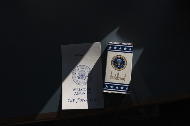 いつものように、圧倒的な規模でありながら整然と進んで行く車列は、私たち報道陣が乗る後方のミニバンから見ても、ほれぼれするほどだった。だが、トランプ氏の任期は刻一刻と終わりを迎えようとしていた。飛行機を降りる際に私は記念品として置かれていたトランプ氏のサイン入りのチョコレート「M&M's」を2〜3箱つかんだ。箱の片面には星条旗を持ったM&M'sのキャラクターが描かれている。別の面には大統領紋章と、トランプ氏のサインが金色で印刷されている。