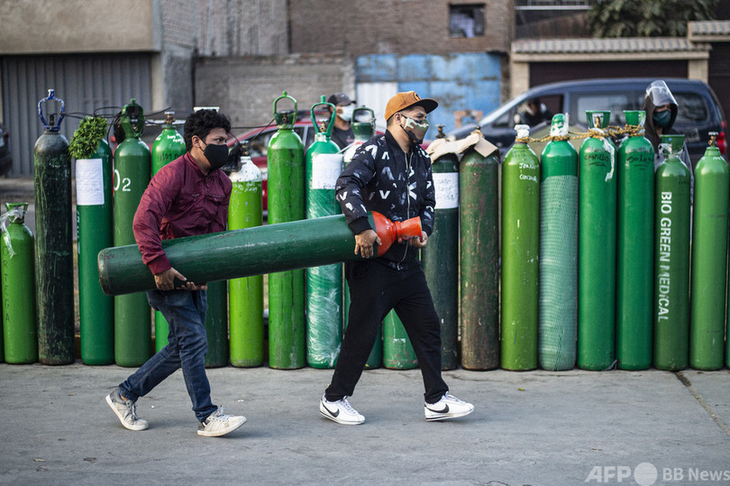 【2月14日 AFP】新型コロナウイルスのパンデミック(世界的な大流行)のさなか、ペルー・カヤオ(Callao)で、空の酸素ボンベを補充するために列をなす人々。