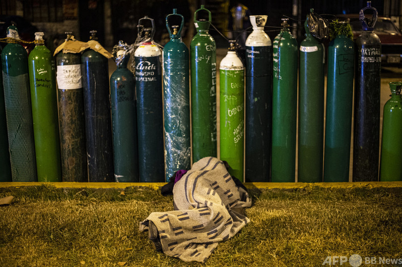 酸素不足で患者が死んでいく同国では、愛する人を生かすために感染者の家族が酸素を切望している。(c)AFP
