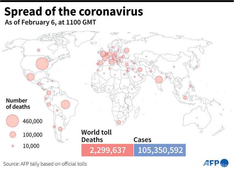 【2月6日 AFP】AFPが各国当局の発表に基づき日本時間6日午後8時にまとめた統計によると、世界の新型コロナウイルスによる死者数は229万9637人に増加した。