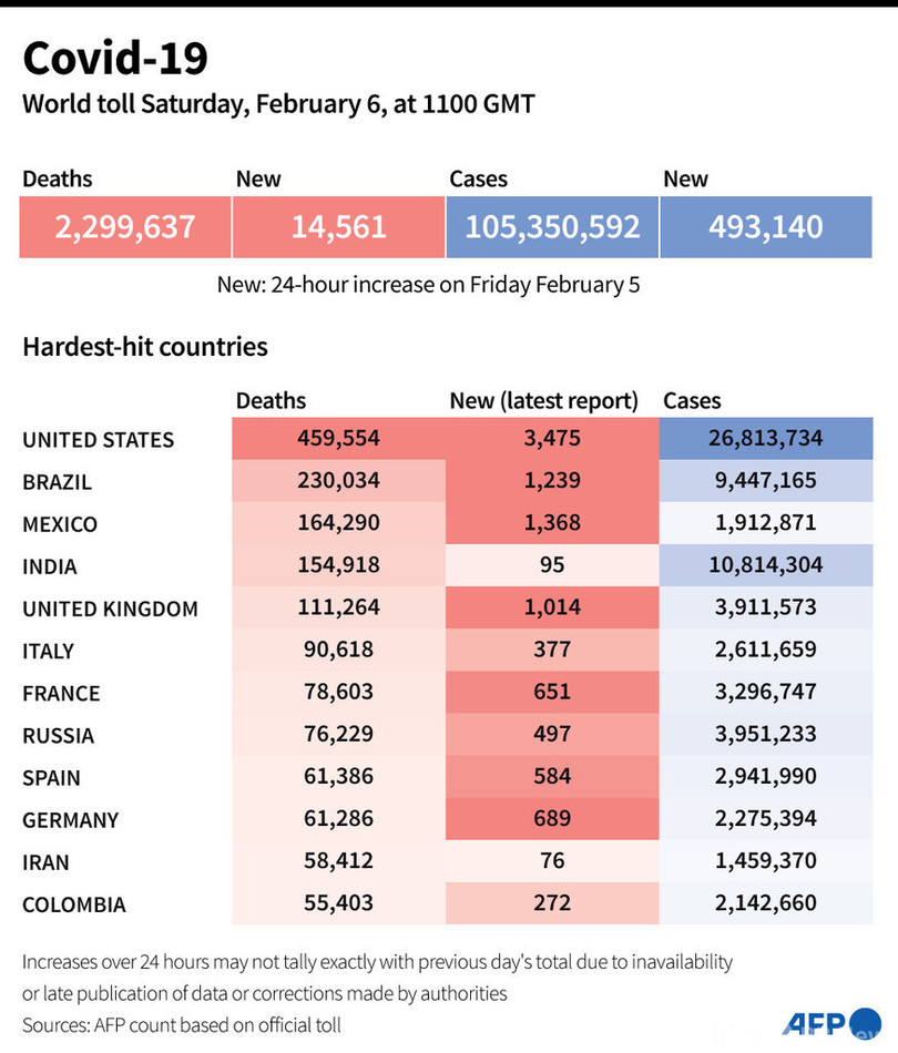 【2月6日 AFP】AFPが各国当局の発表に基づき日本時間6日午後8時にまとめた統計によると、世界の新型コロナウイルスによる死者数は229万9637人に増加した。