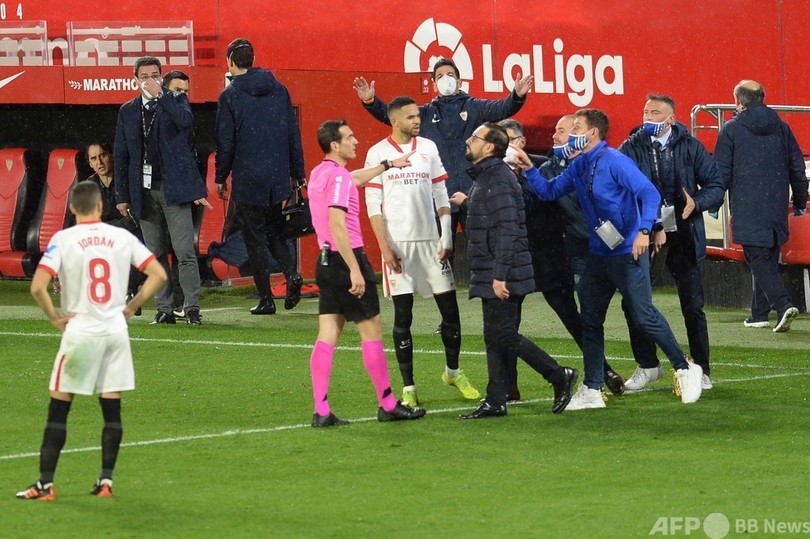 オカンポスは担架の上で涙をこぼしながらピッチを後にしており、このプレーをめぐり口論となったセビージャのフレン・ロペテギ(Julen Lopetegui)監督とヘタフェのホセ・ボルダラス(Jose Bordalas Jimenez)監督は、ともに退席処分を受けてスタンドから試合を見守った。(c)AFP/Thomas ALLNUTT