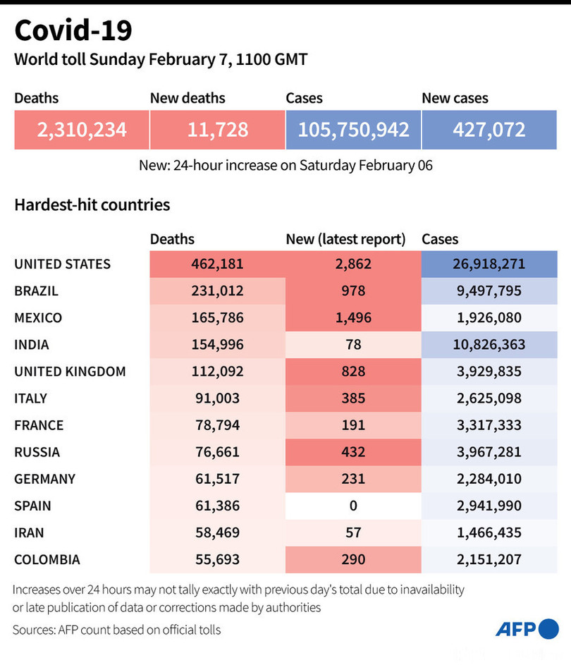 【2月8日 AFP】AFPが各国当局の発表に基づき日本時間7日午後8時にまとめた統計によると、世界の新型コロナウイルスによる死者数は231万234人に増加した。
