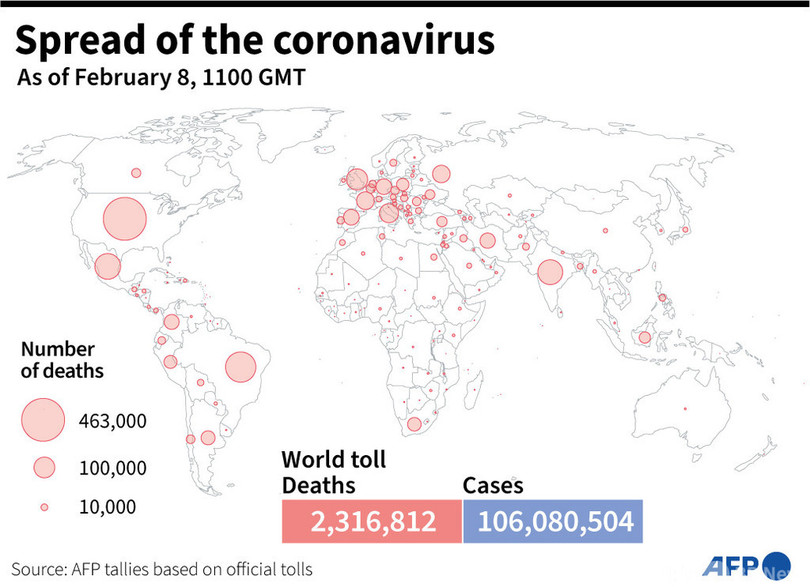 【2月9日 AFP】AFPが各国当局の発表に基づき日本時間8日午後8時にまとめた統計によると、世界の新型コロナウイルスによる死者数は231万6812人に増加した。