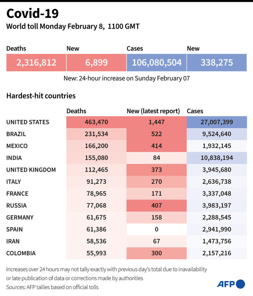 【2月9日 AFP】AFPが各国当局の発表に基づき日本時間8日午後8時にまとめた統計によると、世界の新型コロナウイルスによる死者数は231万6812人に増加した。