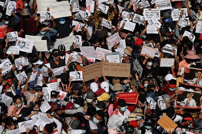【2月9日 AFP】(更新、写真追加)ミャンマー各地で9日、国軍が集会禁止命令を出していたにもかかわらず、4日連続となるクーデターへの抗議デモが行われた。