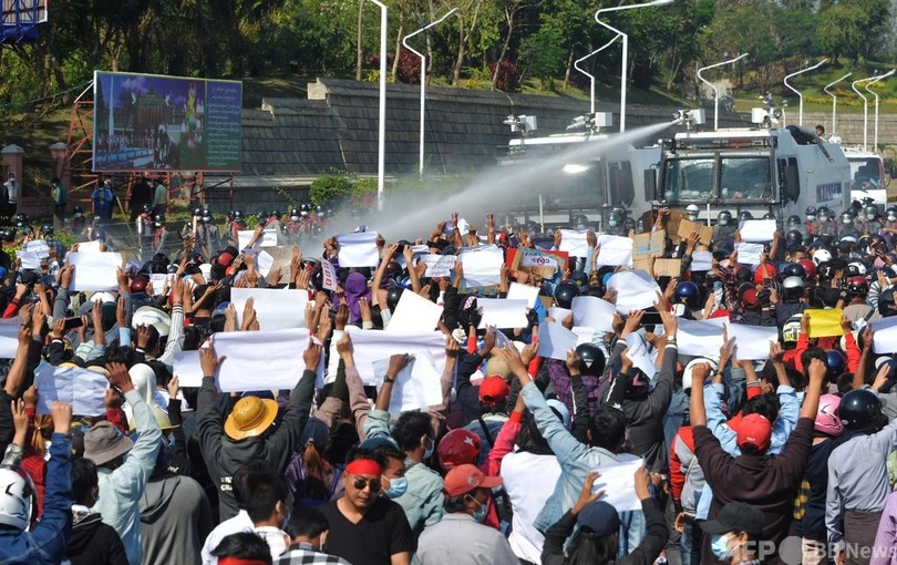 首都ネピドーでも小規模な抗議集会が行われ、警察が何度もデモ隊に向けて放水したが、参加者らは引き下がろうとしなかった。警察が放水した際、デモ隊は「軍事独裁をやめろ」と叫んでいた。(c)AFP