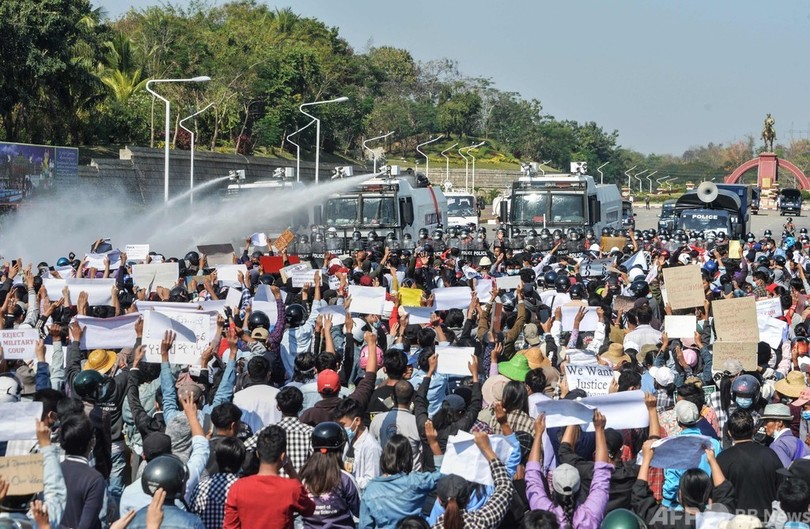 首都ネピドーでも小規模な抗議集会が行われ、警察が何度もデモ隊に向けて放水したが、参加者らは引き下がろうとしなかった。警察が放水した際、デモ隊は「軍事独裁をやめろ」と叫んでいた。(c)AFP