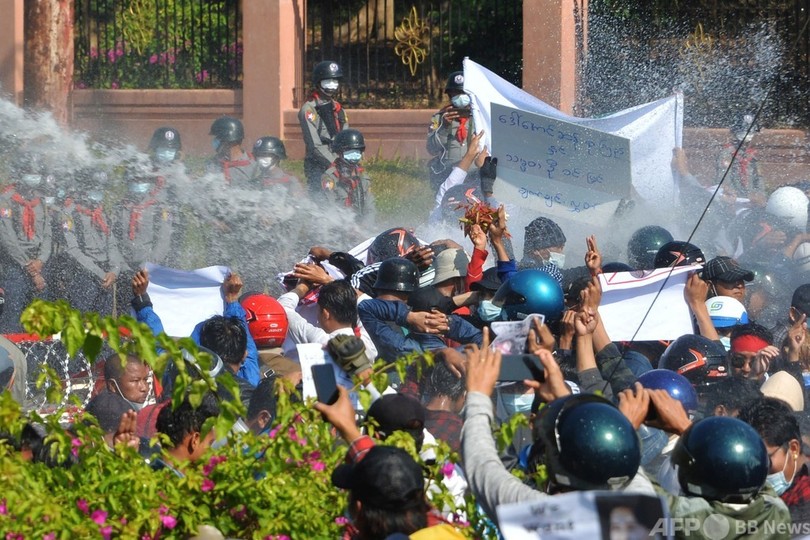 首都ネピドーでも小規模な抗議集会が行われ、警察が何度もデモ隊に向けて放水したが、参加者らは引き下がろうとしなかった。警察が放水した際、デモ隊は「軍事独裁をやめろ」と叫んでいた。(c)AFP