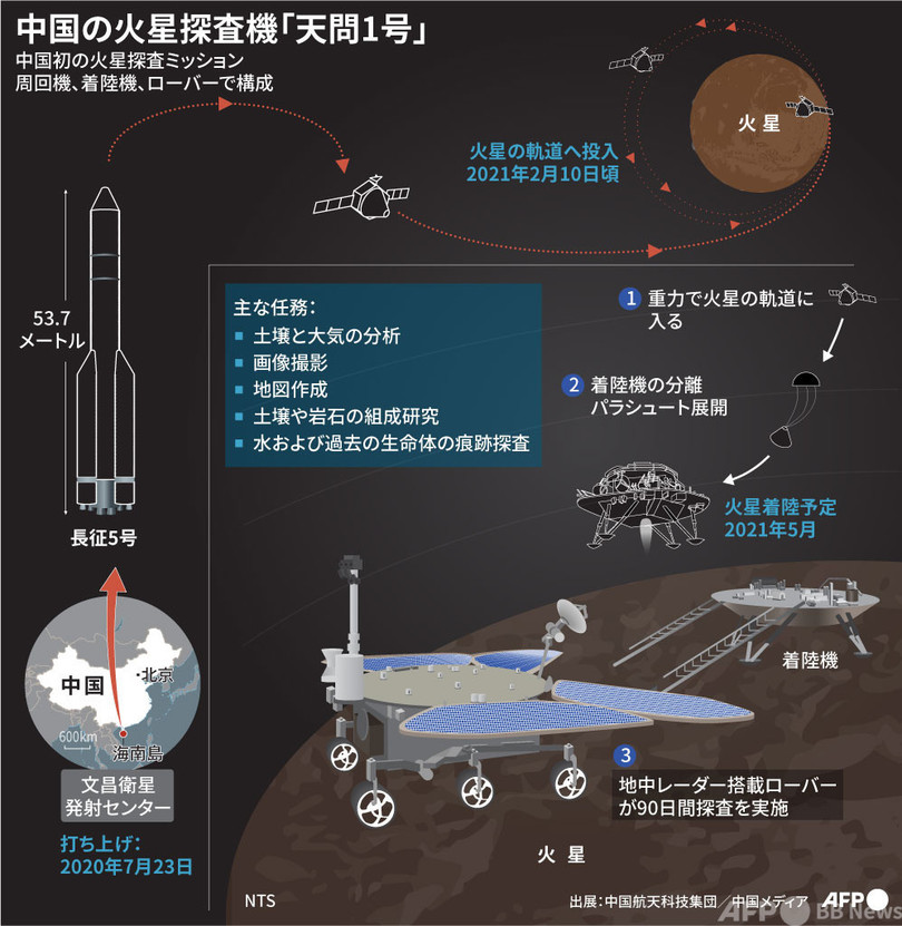 【2月10日 AFP】昨年7月に打ち上げられた中国の火星探査機「天問1号(Tianwen-1)」が10日、火星の周回軌道に到達する予定だ。
