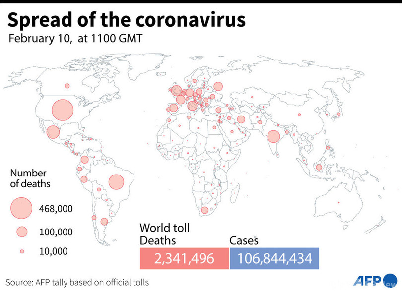【2月11日 AFP】AFPが各国当局の発表に基づき日本時間10日午後8時にまとめた統計によると、世界の新型コロナウイルスによる死者数は234万1496人に増加した。