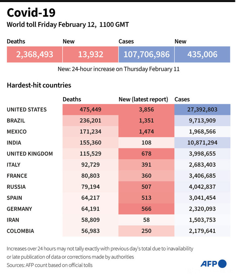 【2月13日 AFP】AFPが各国当局の発表に基づき日本時間12日午後8時にまとめた統計によると、世界の新型コロナウイルスによる死者数は236万8493人に増加した。