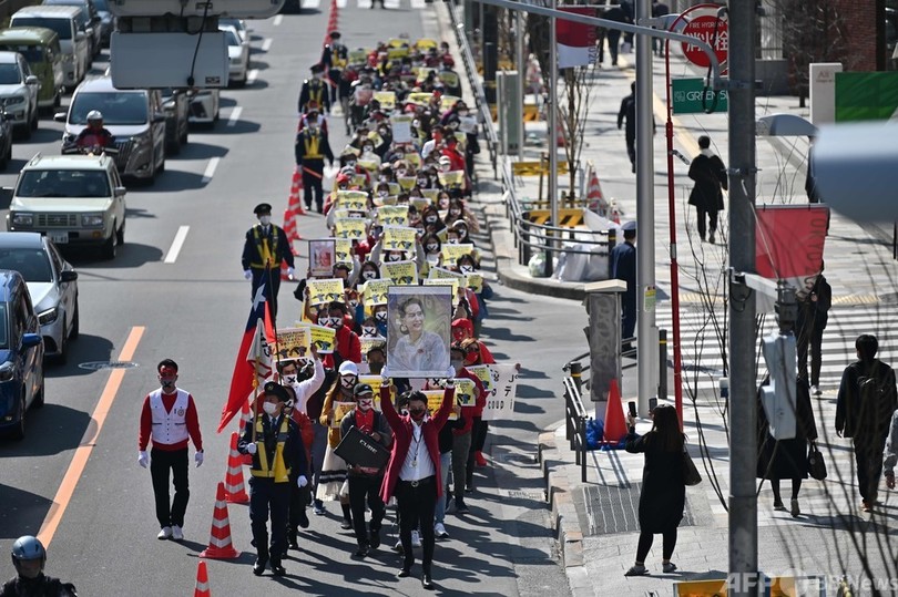 【2月14日 AFP】都内で14日、ミャンマー国軍のクーデターに対する抗議デモが行われた。12日と13日にも、渋谷区の国連大学(United Nation University)前で抗議運動が行われていた。(c)AFP