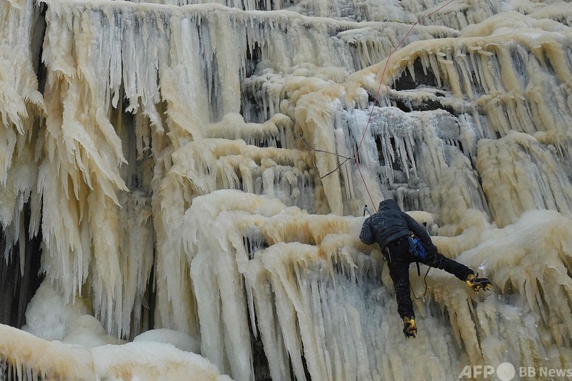 【2月19日 AFP】英国イングランド北西部の氷瀑(ひょうばく、凍った滝)で12日、アイスクライミングに挑む人々の姿が見られた。この滝はヘイフィールド(Hayfield)近郊ピーク・ディストリクト国立公園(Peak District National Park)内のキンダー・ダウンフォール(Kinder Downfall)で、辺り一帯はこの日、雪に覆われた。(c)AFP
