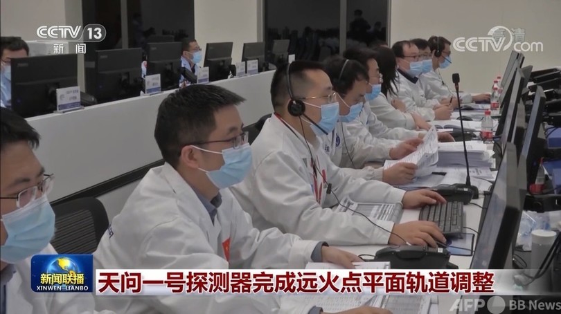 15日に行われた遠火点の平面軌道修正では、「天問1号」に搭載された3000ニュートンのエンジンが探査機の移動ルートを火星の両極を通る周回軌道に修正し、近火点の高度を約265キロに調整しました。その後、数回の軌道修正を経て火星の待機軌道に進入する予定です。(c)CGTN Japanese/AFPBB News