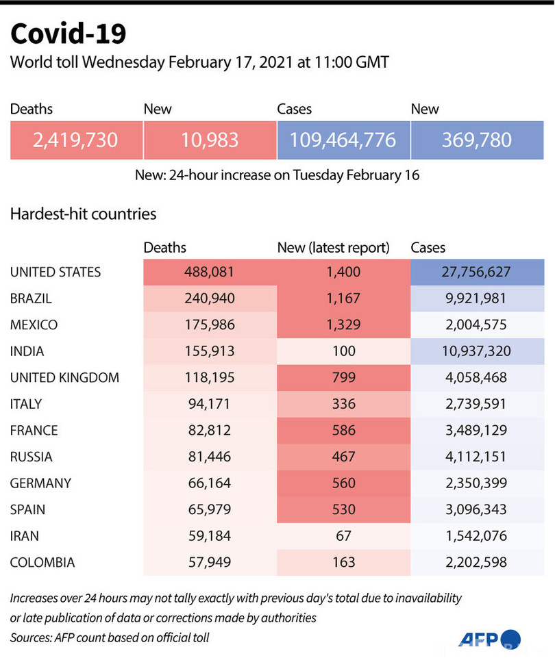 【2月18日 AFP】AFPが各国当局の発表に基づき日本時間17日午後8時にまとめた統計によると、世界の新型コロナウイルスによる死者数は241万9730人に増加した。