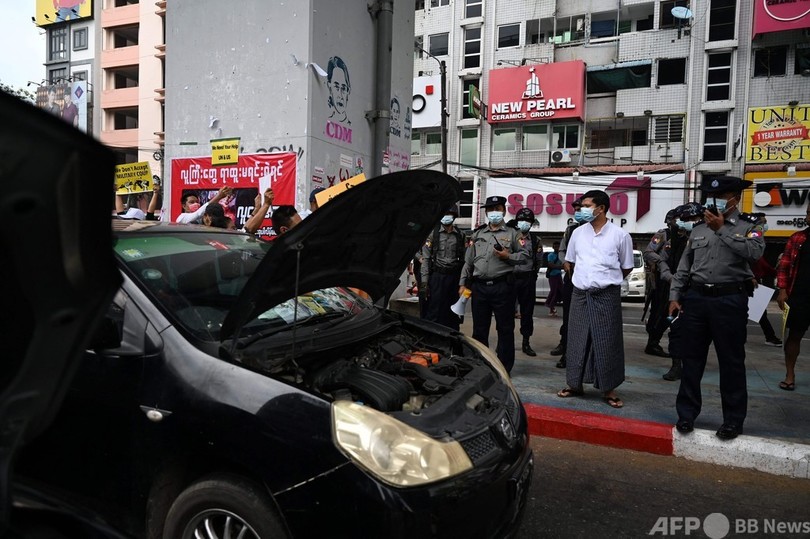 最大都市ヤンゴンでは18日も、前日に引き続き、故障したと見せ掛けてボンネットを開けた状態の車両で道路を封鎖し、治安部隊の通行を妨げるデモが各所で展開された。